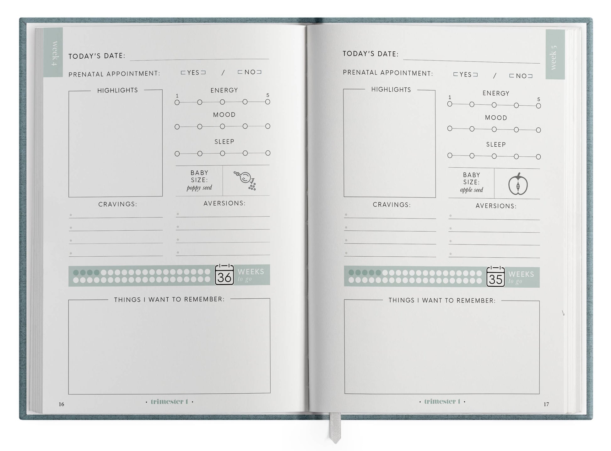 Our incredibly easy-to-use design lets you track weekly progress through all three trimesters, including your mood, energy level, sleep habits, highlights, cravings and more.